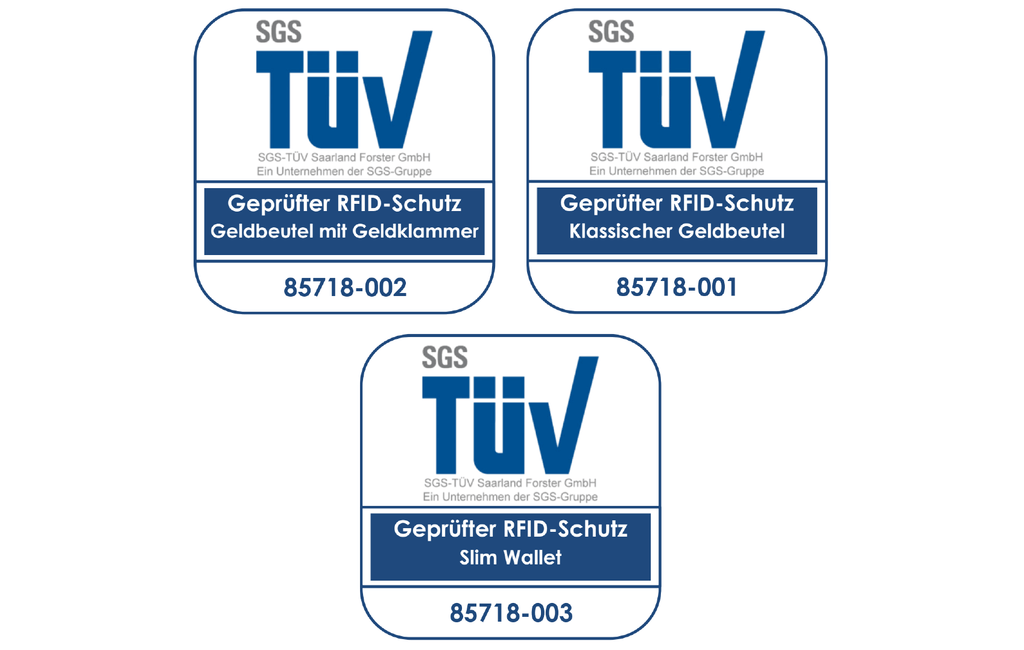 Unsere Geldbeutel wurden von einem unabhängigen Institut am 20.08.2018 geprüft und zertifiziert. Sie blockieren verlässlich die Standardfrequenz 13,56 Mhz und schützen deine Karten vor Datendiebstahl durch RFID & NFC Scanner.
